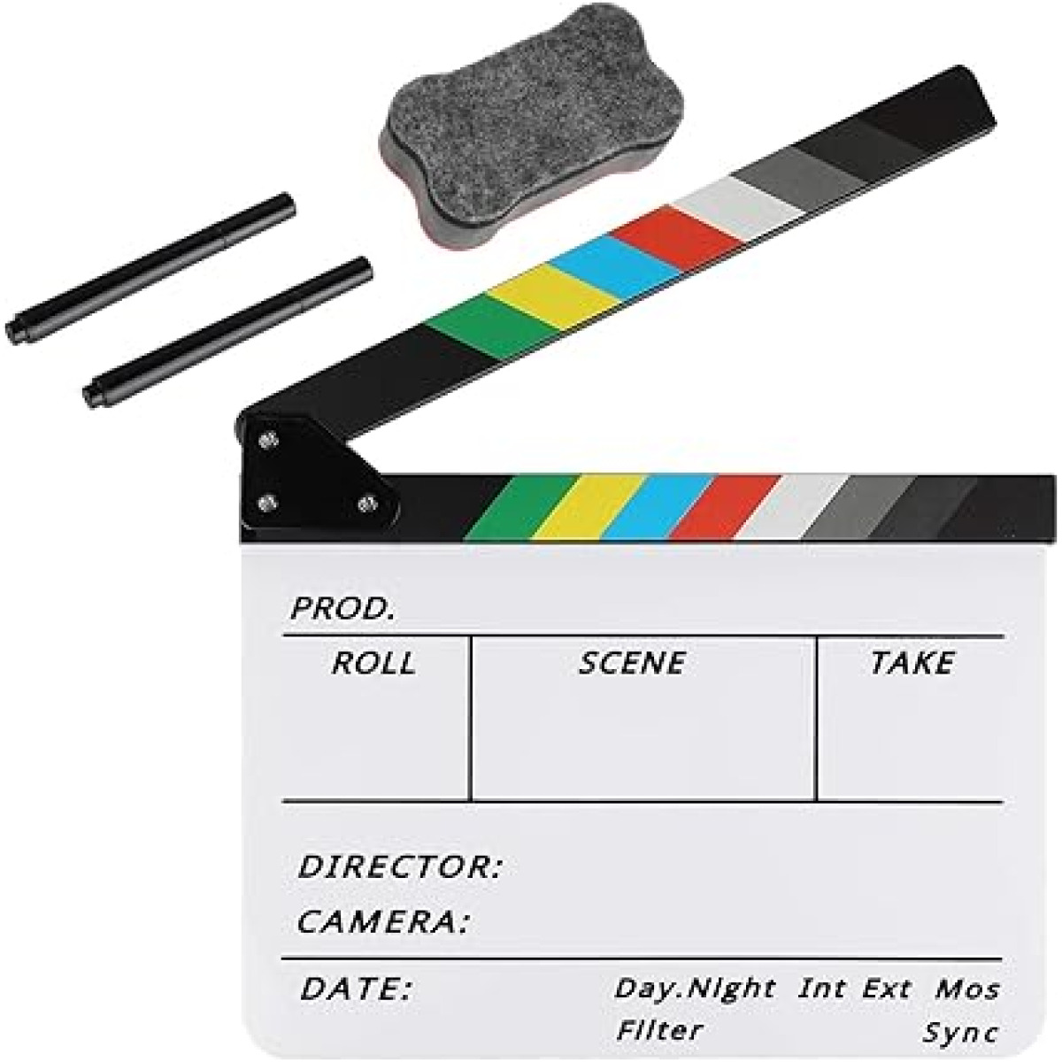 Clap de cinéma utilisé pour la synchronisation image/son. Plaque ardoise avec bras articulé produisant un claquement net identifiable à l’enregistrement audio. Surface inscriptible pour métadonnées de tournage. Usage tournage vidéo; fiction et pédagogie.